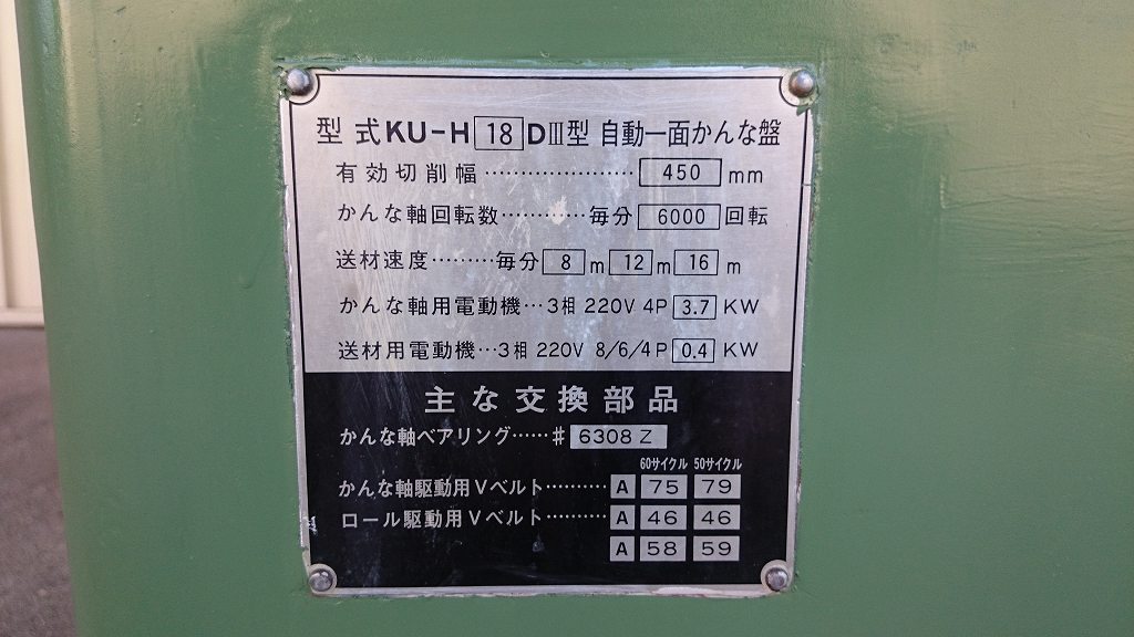 • ■売約済み【クワハラ】中古自動一面かんな盤 KU-H18DⅢ(450幅) 3枚刃